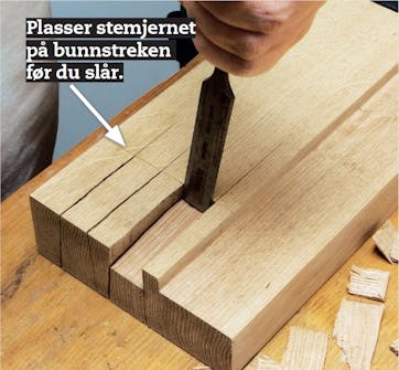 Stem ut tappene. Når tappene er saget ut på to sider, skal hullet stemmes ut. Slå stemjernet loddrett ned med et par kraftige slag nøyaktig etter bunnstreken. Husk å vende jernets flate side inn mot streken.