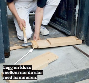 Når du har tilpasset terskelen, skrur du den fra hverandre og banker de to halvdelene forsiktig inn i karmene. Først når du er sikker på at delene passer, legger du kiler under bladskjøten og setter den sammen med lim og skruer. Når limet er tørt, klosser du opp terskelen med kiler.