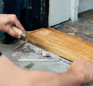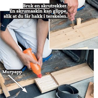 Lim den brede bladskjøten med pva-lim til utendørs bruk. Legg først under murpapp, helt ut under dørkarmen, og kloss opp terskelen én cm fra underlaget. Skru deretter sammen de to delene med rustfrie, syrefaste skruer.