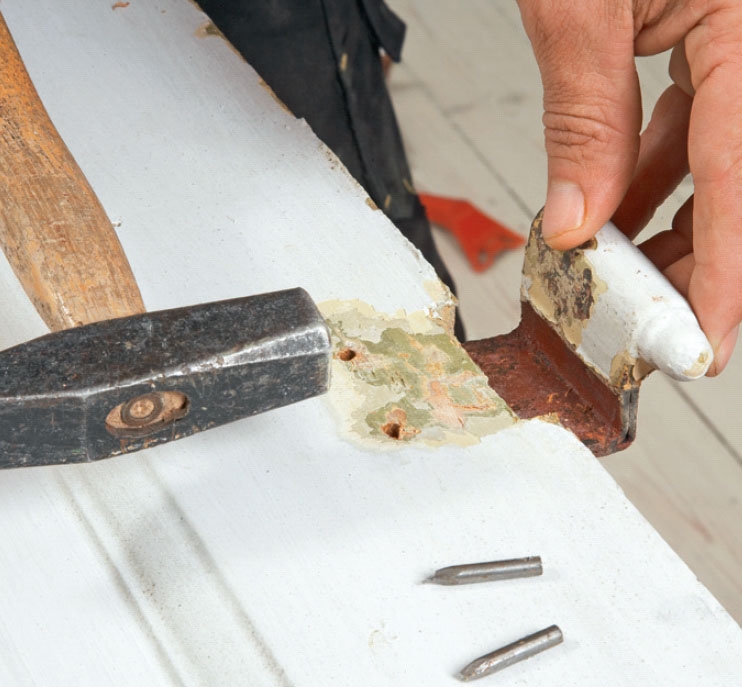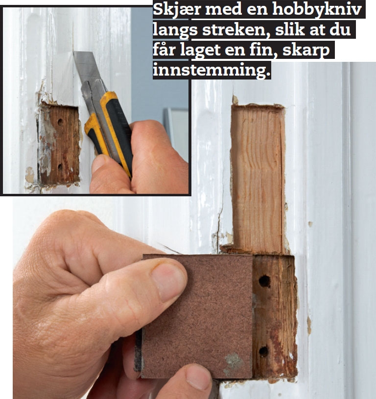Stem inn hengselet i døren. Skjær først med en hobbykniv, og stem av i småbiter slik at du ikke får stemt for dypt eller får slått av en flik.
