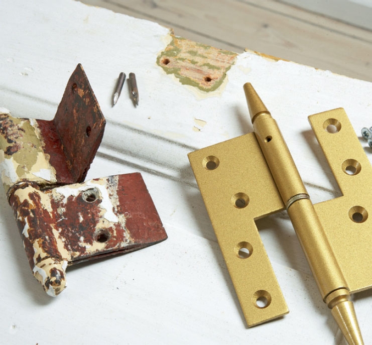 Ettersom hengslene ikke er maken til de opprinnelige, skal det stemmes ut til dem både i karmen og døren.