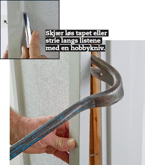 Dra av listene på begge sider. Det gjøres best med et brekkjern. Hvis du gjør det forsiktig, kan du kanskje bruke dem om igjen.