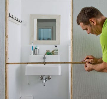 Listene på badet skal ikke gå ned til gulvet, på grunn av fukten. Kloss dem opp før de måles opp og monteres. Tett sprekken med en elastisk silikonfuge.
