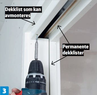 Sett dekklister på overkarmen. En list monteres permanent på den ene siden. På den andre siden skrur du den fast gjennom forborede hull. Listen på denne siden skal kunne tas av hvis døren skal avmonteres.