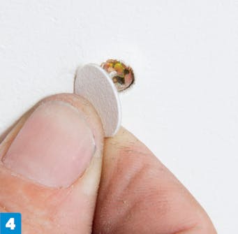 Skjul de synlige skruene i anslaget og på den ene dekklisten med hvite dekknapper. Du kan også sparkle skruehullene, men da må du også male for å få det pent.