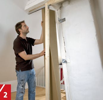 Skinna til skyvedøra skal skrus fast på ei solid lekt. Her settes lekta fast på to bjelker som sitter på siden av sperra. På den måten blir lekta gjemt bak sperra, og vi bevarer så mye som mulig av de synlige bjelkene. Lekta skal plasseres så høyt som mulig for å få nok høyde på døra. Tilpass både lekter og bjelker med sag og stemjern. Du risikerer å svekke bjelkene unødig hvis du bare skjærer ut i bjelkene.