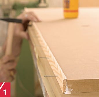 Kantlistene limes og stiftes på dørenes to sidekanter. Vi setter en 25 mm stift for hver 20 cm og forsenker stiftenes hoder med en dor.