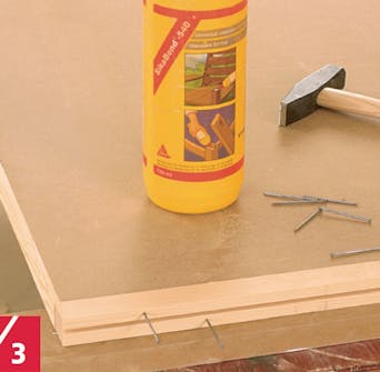 De få overskytende millimetrene (listene er 21 mm brede, og MDF-plata er 19 mm tykk) fjernes når limet er tørt. Bruk høvl eller eksentersliper til arbeidet.