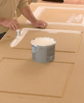 Dørene grunnes og males. De fresede sporene males med pensel, de store flatene kan males med rull. Dørene males på begge sider for å unngå krumning. Rullebeslagene skrus fast nær hjørnene.