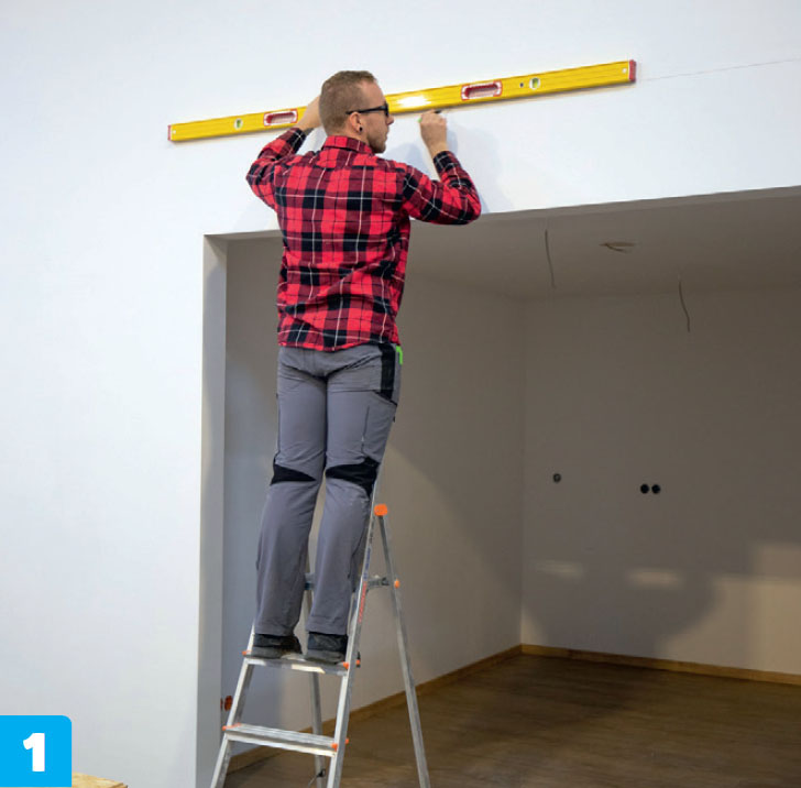 Veggskinnen over døråpningen holder skyvedøren på plass, slik at den ikke vipper inn eller ut. Den skal slik sett ikke holde vekten til skyvedøren, fordi skyvedøren hviler på hjul, men du må likevel ta hensyn til hvilket veggmateriale du skrur den inn i, og bruke passende plugger og skruer. Her er veggen av gipsplater utenpå skrufaste treplater. Derfor bruker vi treskruer.