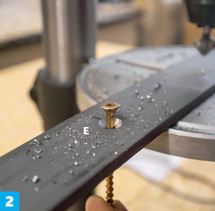 Forbor til et hull i midten av skinnen (E) (flatstålet) for hver 35-36 cm. Her tilsvarer det 13 hull i veggskinnen. Sørg også for å bore opp hullene slik at skruehodene kan undersenkes i skinnen.