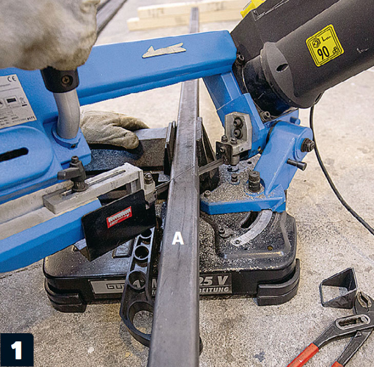 Kapp firkantrørene (A) til dørrammene. Endene skal passe sammen i 45 grader. Har du ikke en metallbåndsag, må du bruke en vinkelsliper. Men pass på at snittene ikke blir så grove at rammen blir skjev.
