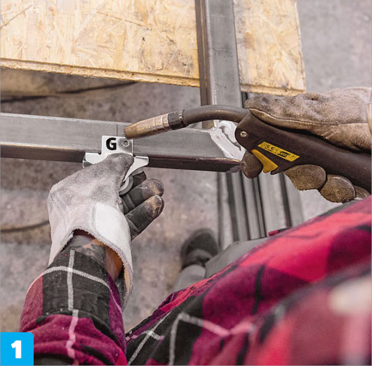 Legg firkantrørene (A) på arbeidsbordet, og heft det første hjørnet sammen med to punktsveisinger. Når vi kun punktsveiser, er det nemlig fortsatt mulig å justere litt på vinklene til hjørnene.