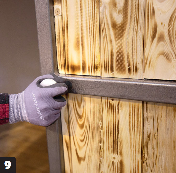 Baksidene av dørrammene dekkes med en OSB-plate, som går fra kant til kant. På den måten kan de svidde bordene limes på innenfor selve stålrammen. Dermed blir det ingen synlige skruer. Vi viser hvordan du bygger den store rammen med vinduene i. Etterpå kan du bruke den samme fremgangsmåten til å bygge den lille.
