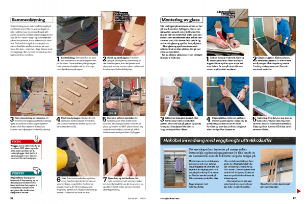 Til utskjæringen av MDF-platene, bruker vi en dykksag med føringsskinne. Fordelen med den, er dels at den er rask å jobbe med, dels at det er enkelt å oppnå høy presisjon. Velger du i stedet å bruke en vanlig sirkelsag og en rettholt å styre etter, skal du regne med å bruke mer tid på oppgaven. Du må også være ekstra nøye for å oppnå et like nøyaktig resultat. Hvis du velger en løsning med en glatt dør uten glass, vil det være lettest å få platene skåret ut i byggvarehuset. Da skal du bare male og montere dørene.