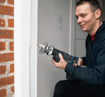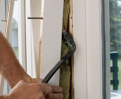 Så skal karmen vekk. Er den spikret, er det en god idé å sage over spikrene med et baufilblad eller ei bajonettsag slik at du ikke må slite alt for mye for å få den ut.