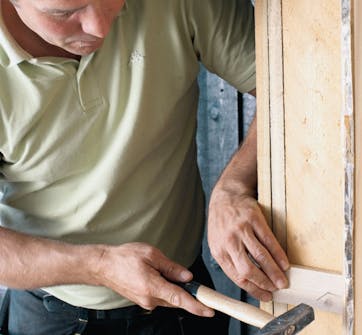 Fjern først eventuelle utfôringer. Den er brukt her fordi veggen er tykkere enn dørkarmen. Er den malt eller tapetsert, kan du skjære den løs med en hobbykniv før du brekker den fri.