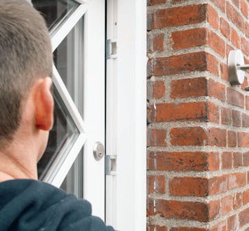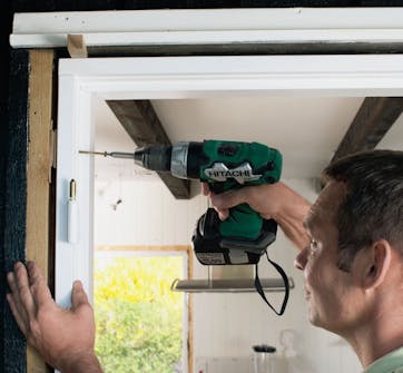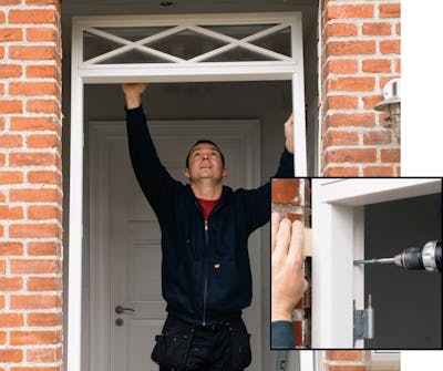 Karmen settes opp slik at den flukter med veggen. Bor opp med 6 mm trebor i falsen, og sett i 6 x 100 mm treskruer. To i den øverste fjerde delen, en rett under midten og en 10-15 cm fra dørstokken. Begynn på hengselsiden.
