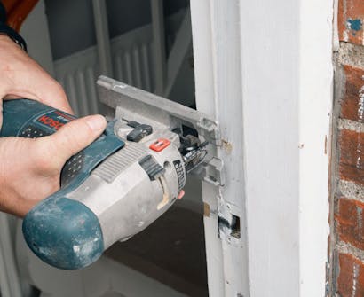Sag over eventuelle spiker mellom karmen og muren med ei bajonettsag eller et baufilblad. I gamle hus er det ofte brukt kraftige spiker. Ved å sage dem over, unngår du å skade muren og pussen når karmen skal fjernes.