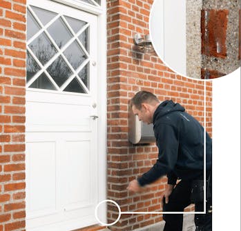 Ei 65 kilo tung dør krever sin mann - og sitt hus. For det er ikke lett å skulle holde ei tung dør som åpnes og lukkes dag etter dag. - Spesielt i et murhus: En mørtelfuge langs dørkarmen kan sprekke opp og løsne med tiden. Derfor bruker vi i stedet en gummifuge der man tidligere pleide å bruke mørtel. Men om du ønsker kan den forkles slik at den ser ut som en mørtelfuge.