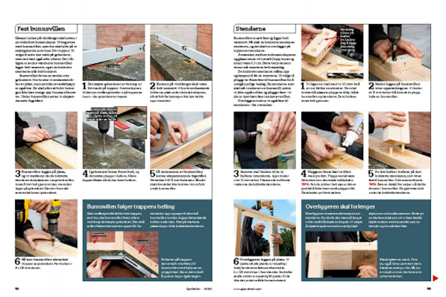 I gelenderet bores 8 mm hull, og det settes plugger i hullene. Kilene legges tilbake når du har boret hullene.