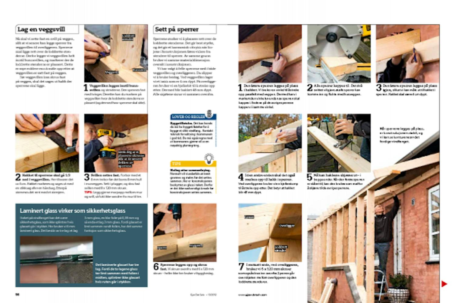 Glassrutene bestilte vi allerede før byggingen satte i gang. Det kunne vi, fordi vi hadde målt opp nøyaktig og laget en arbeidstegning. Nå er tiden kommet for å sette inn rutene, og vi begynner med det laminerte glasset i taket.