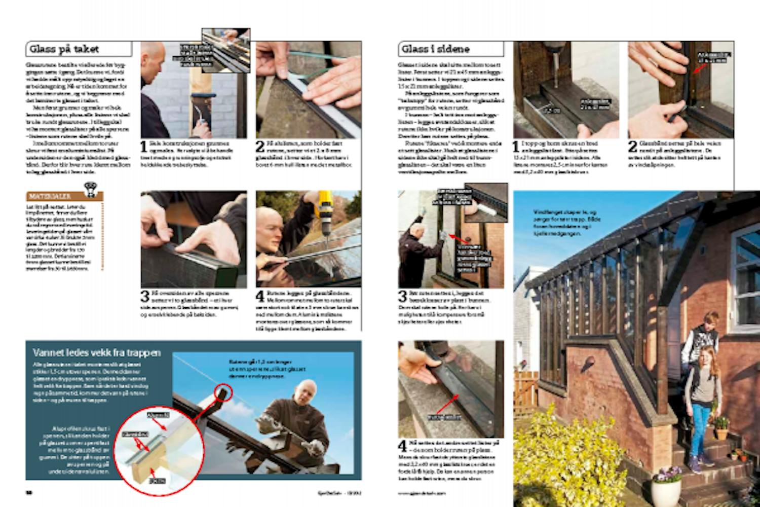 Alle glassrutene i taket monteres slik at glasset stikker 1,5 cm utover sperren. Dermed danner glasset en dryppnese, som i praksis leder vannet helt vekk fra trappen. Bare når det er hard vind og regn på samme tid, kommer det vann på rutene i siden - og på muren til trappen.
