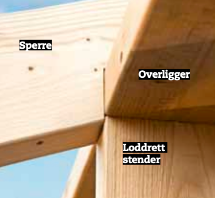 Vi har valgt å felle sperrene ned i både veggsvillen og overliggeren. Da slipper vi å bruke beslag. Ved veggsvillen lager vi et hakk som er 4 cm dypt. På overliggeren bruker vi en bjelkebit til å streke opp etter. Dermed blir hakket 48 mm dypt. Alle skjøtene skrur vi sammen ovenfra.