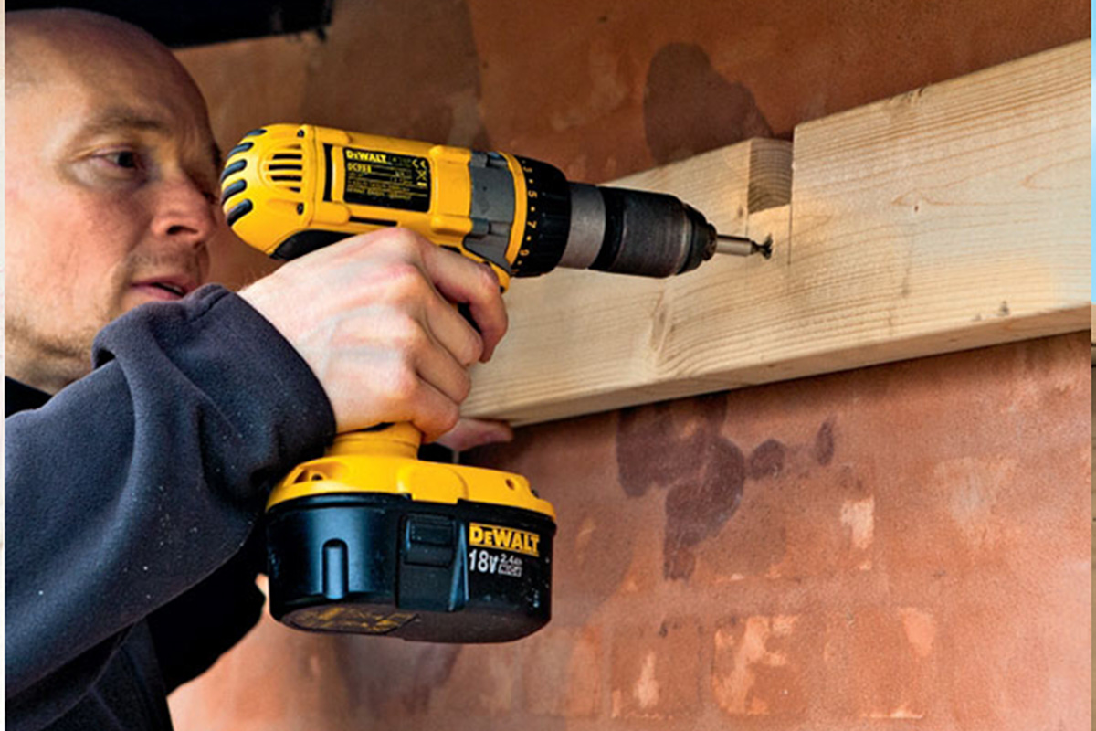 Svillen settes fast. Forbor med et 8 mm trebor før det bores 8 mm hull i murveggen. Sett i plugger, og skru fast svillen med 8 x 120 mm skruer. Merk deg at vi plasserer skruene slik at de senere dekkes av sperrene.