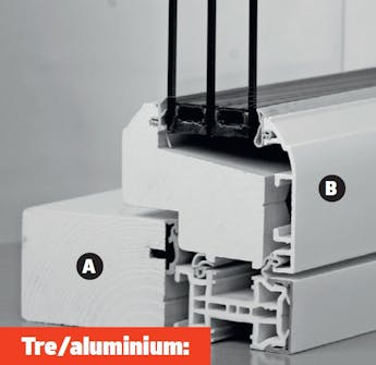 Tre-/aluminiumsvinduer kombinerer det klassiske treet med en utvendig skjerm av aluminium. På den måten får du det klassiske treutseendet A innvendig i huset, men et (stort sett) vedlikeholdsfritt ytre B. På de tidligste vinduene med denne løsningen, dannet aluminiumen en kuldebro utenfra og inn i huset, men i dag har produsentene løst dette kjedelige problemet. Derfor er tre/ aluminium like godt isolerende som rene trerammer i dag.