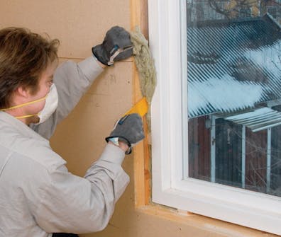 Strimler av mineralull dyttes på plass rundt vinduet med en trepinne. Bruk lange strimler slik at du unngår skjøter (og dermed kuldebruer) i hjørnene. Bruk hansker og vernemaske mot støv.