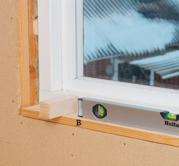 Tykkelsen på støttebordet (B) som skal ligge under vindusbrettet (A), finner du ved hjelp av en trekloss som tilsvarer tykkelsen på vindusbrettet. Mål avstanden fra undersiden av klossen og ned til undersiden av åpningen.