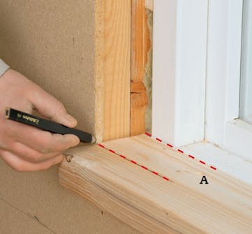 Legg vindusbrettet (A) så vannrett som mulig, og merk opp tykkelsen på veggen på plata. Her vil vi gjerne ha plata til å stikke noe ut på hver side av vindusåpningen slik at vi sager den ca. 30 cm for lang før vi merker opp.