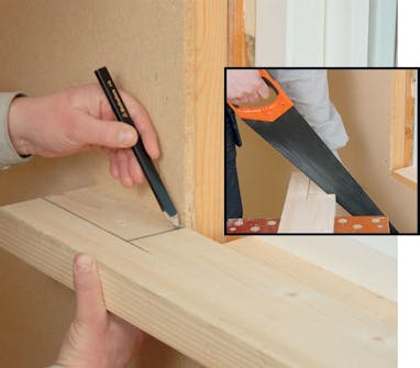 Flytt brettet ut av vindusåpningen, og markér nøyaktig hvor bredt hullet er. Firkanten du har markert, tilsvarer den biten du skal sage av brettet.