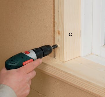 Mål opp til utfôringene (C) med vinkel og meterstokk, og mål opp i alle fire hjørnene. Legg gjerne til et par millimeter, for blir utfôringene for små, er det vanskelig å få til et fint resultat når vinduslistene skal monteres.