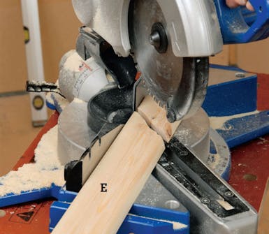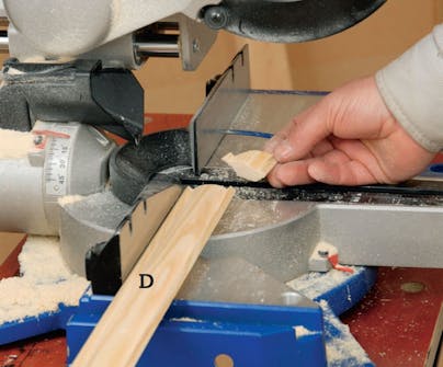 Sag av to små biter av dekora sjons-lista (D) på skrå (45 grader). De to bitene skal være like lange som lista er tykk, men gjæringssnittene skal være motsatt fordi bitene skal bli til endestykker som passer til den lange lista.