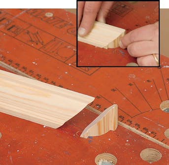 Sag dekorasjonslista på skrå i begge ender. Den nøyaktige lengden finner du ved å måle 2 cm inn fra begge sider på profilen som du freste på undersiden av vindusbrettet. Deretter limer du fast de to små bitene.