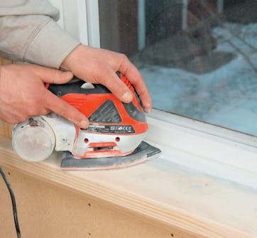 Vindusbrettet slipes når du har sparklet sammenføyningene mellom karmen og brettet. Det kan være vanskelig å få et godt resultat første gang, så regn derfor med at det kan være nødvendig å sparkle og slipe to ganger til.