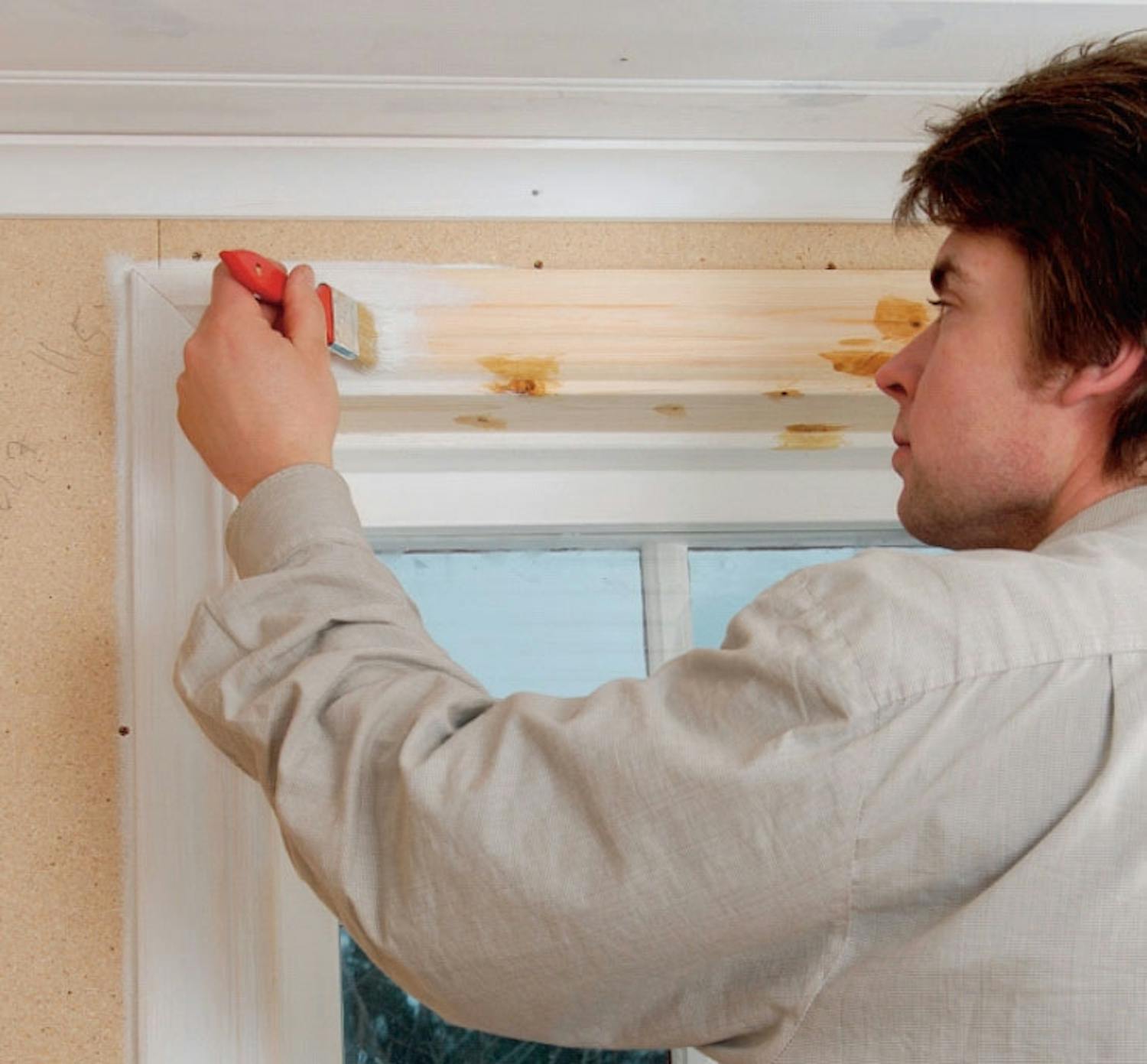 Vinduspartiet grunnes før alle spiker- og skruehull i utfôringene og listene sparkles. Før grunning strykes eventuelle kvister med kvistlakk slik at harpiksen ikke trenger gjennom.