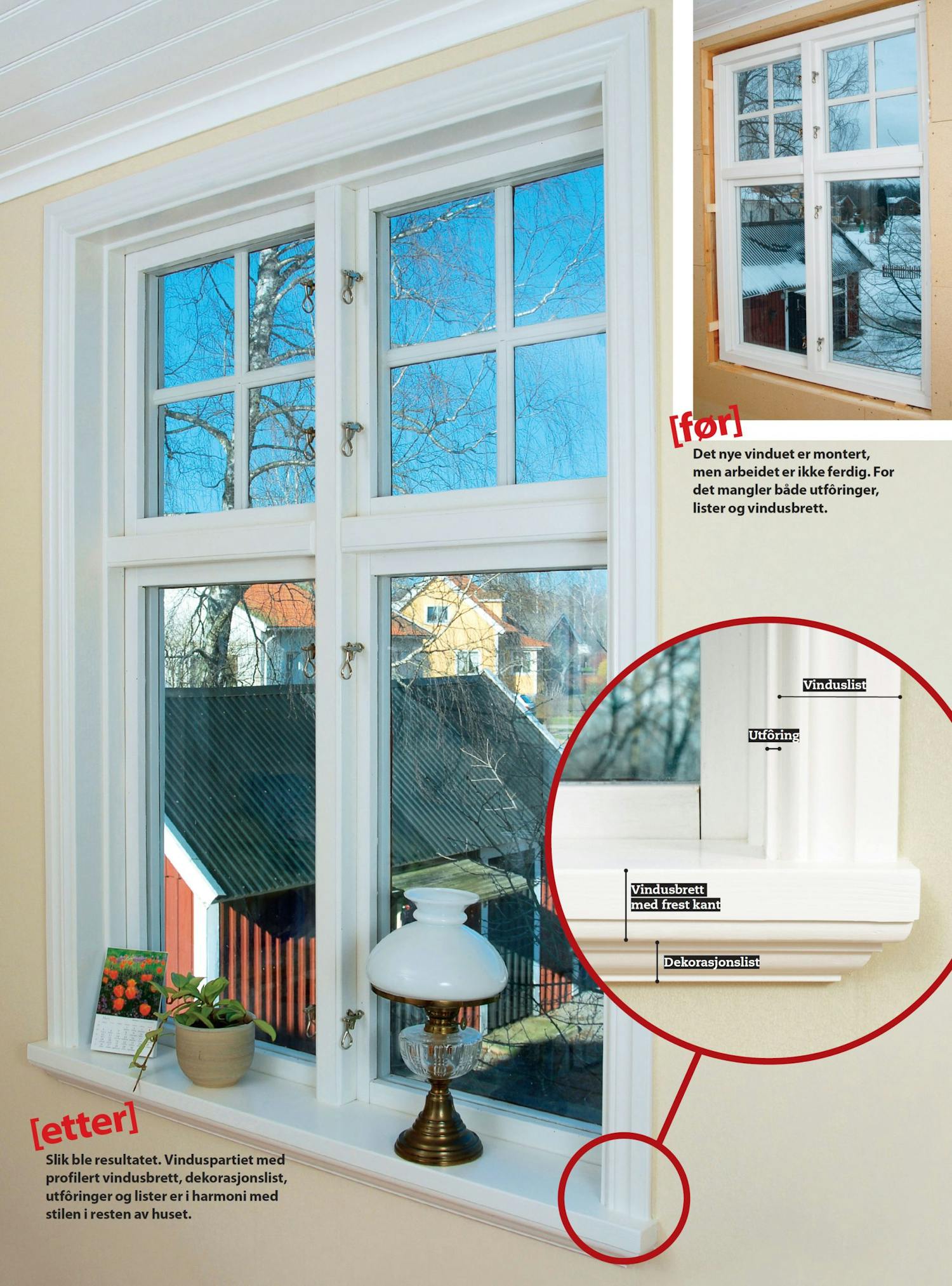 Tykkelse og bredde på det emnet du skal bruke til vindusbrett, avhenger av størrelsen på vindusåpningen og tykkel sen på veggen. Her passet det med en 45 x 145 mm glattkant furu som ble saget og høvlet til i en tykkelse slik at det blir liggende nøyaktig på høyde med over siden av vinduskarmen.
