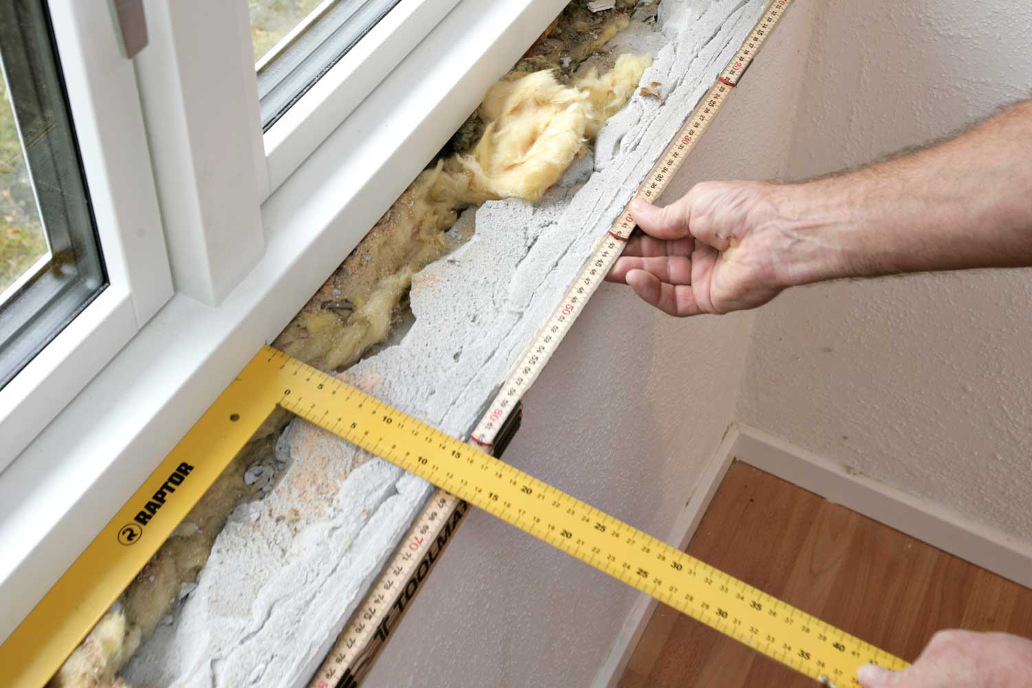 Merk opp hvor bærelisten skal sitte på vinduets bunnkarm. Fordi vindusplaten skal ligge på veggen, og vinduet er i lodd, gjøres det lettest med en vinkel. Legg til 4 mm for å justere vekk skjevheter.