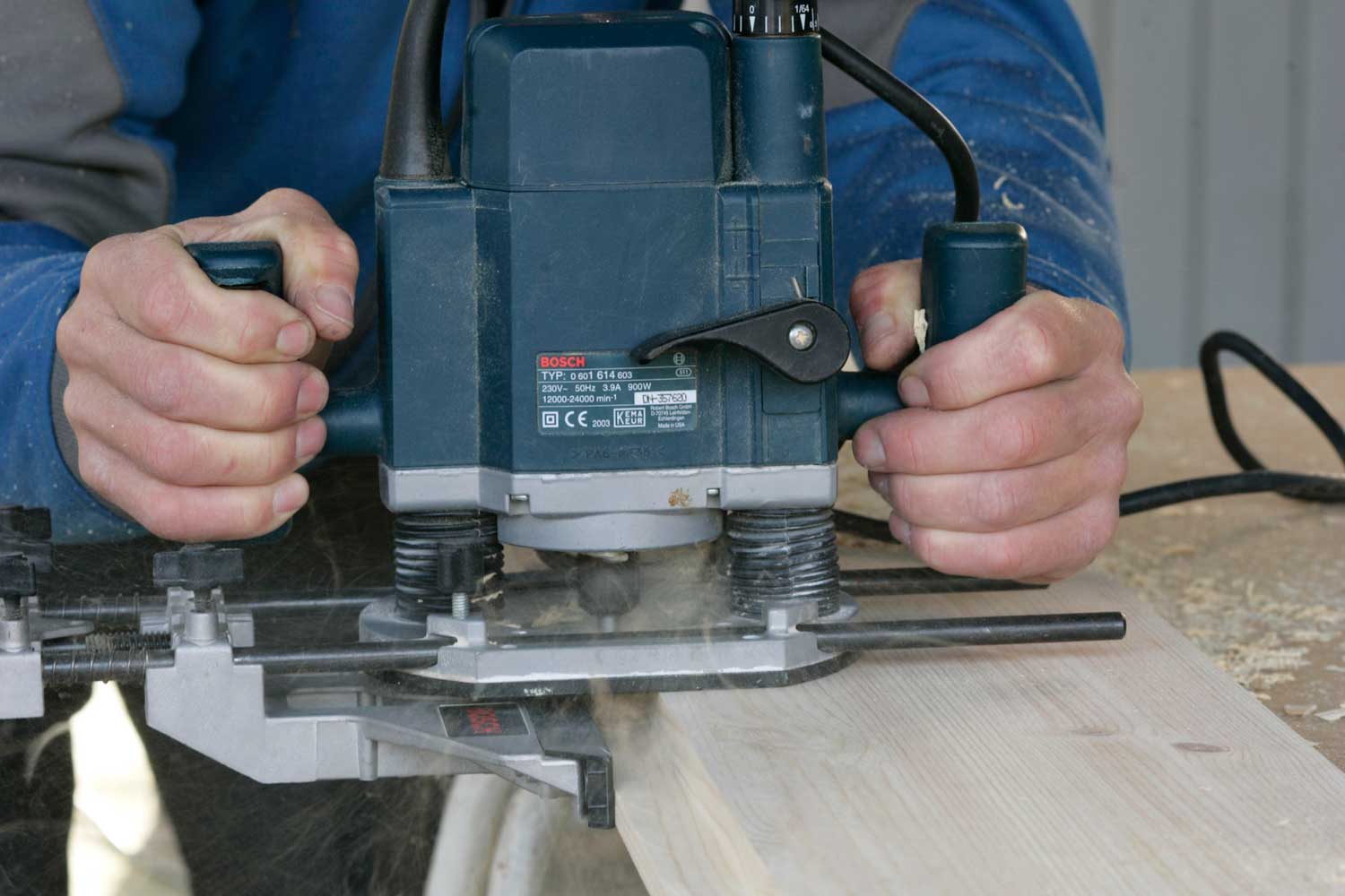 Falsen freses i to-tre omganger. Hver gang presser du overfresen litt tettere mot den innstilte dybden. Da jobber fresestålet så jevnt som mulig.