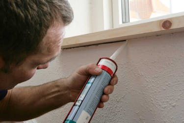 Du vil ikke ha hull etter skruer i den nye vindusplaten, så du limer og fuger den på plass når den er ferdig montert.