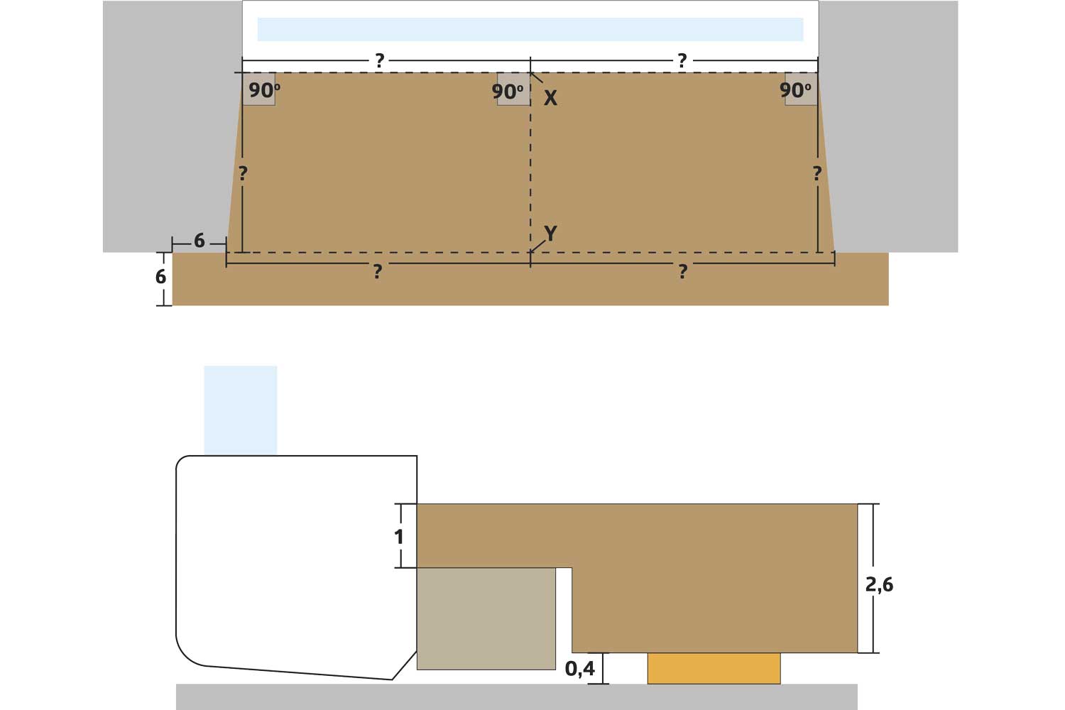Ta alle målene fra tegningen. Start med å markere et punkt omtrent midt på bunnkarmen (X). Overfør punktet vinkelrett til veggens forkant (Y). Det er fra disse punktene at alle mål tas.