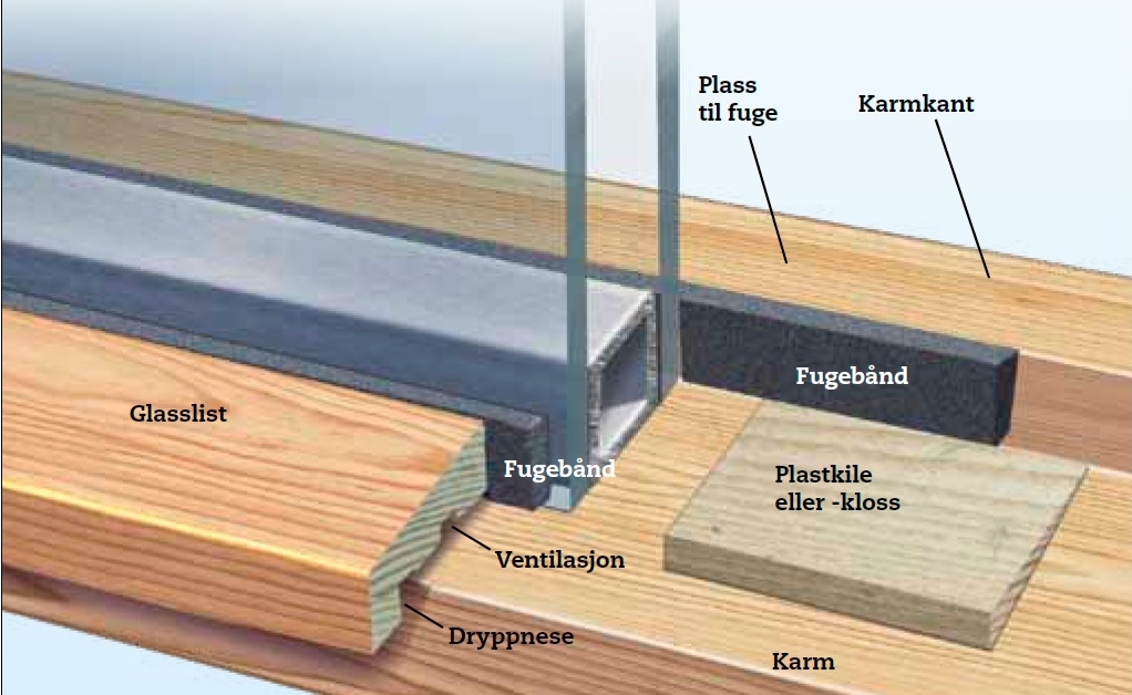 Når den gamle ruten er tatt ut, skal alle kanter renses nøye, og treverket skal ha et strøk med grunningsolje. Når den nye termoruten skal på, skal den stå på en plan flate, på plastklosser eller kiler, slik at det er luft mellom ruten og karmen. Både inn og utvendig skal ruten ha klebende fugetetningsbånd som settes på henholdsvis glasslisten og karmtreet. Innvendig bør fugebåndet settes litt under karmkanten, slik at det kan legges en syntetisk fuge øverst, som settes på treet. Glasslisten skal både ha et ventilasjonsspor, som hindrer innsuging av fukt, og en dryppnese, slik at regnvannet drypper av i stedet for å renne inn under listen.