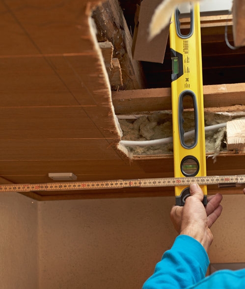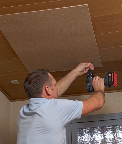 Konstruksjonen sjekkes gjennom et lite hull. Vi borer et 10 mm hull, og skjærer et hull godt innenfor den forventede plassering med stikksagen. Da ser vi om ting er som forventet bak takplatene.