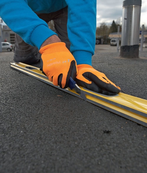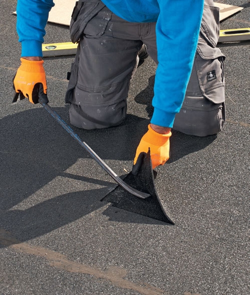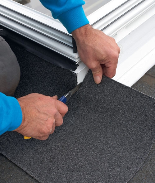 De siste snittene i takbelegget skjæres på stedet. Legg belegget der det skal sitte, og skjær det til etter hjørnet på vinduet. Her er det ekstra viktig med en skarp kniv. Begynn med stykket nederst.