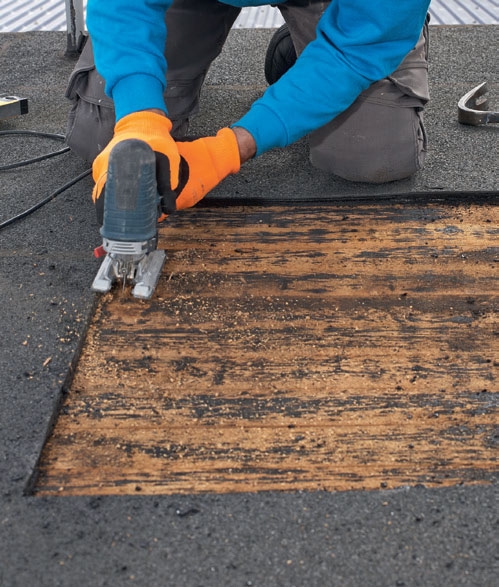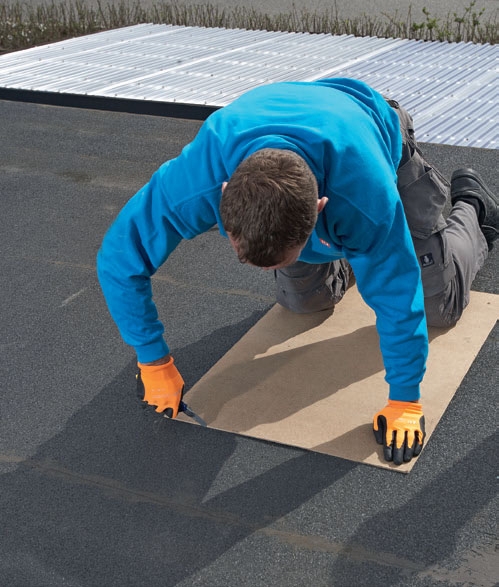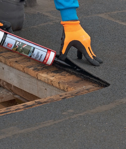 Den gamle takpappen settes fast. Det vil som regel være noe av pappen rundt som ligger løst. Dette kleber du fast til bordene med en tettemasse.