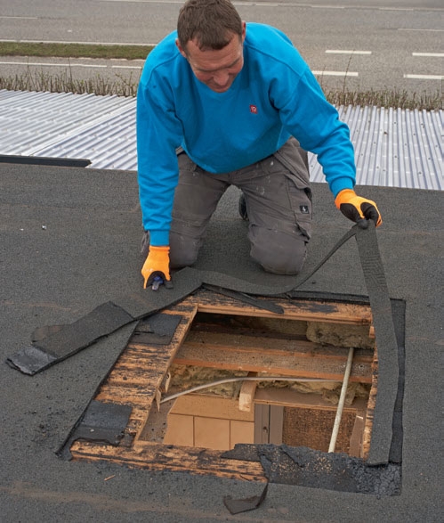 Takpappen innenfor de fire snittene fjernes. Dette er et gammelt papptak, med tre lag papp, og det tar litt tid å skjære gjennom og fjerne alle lagene. Et brekkjern var til god hjelp for oss.