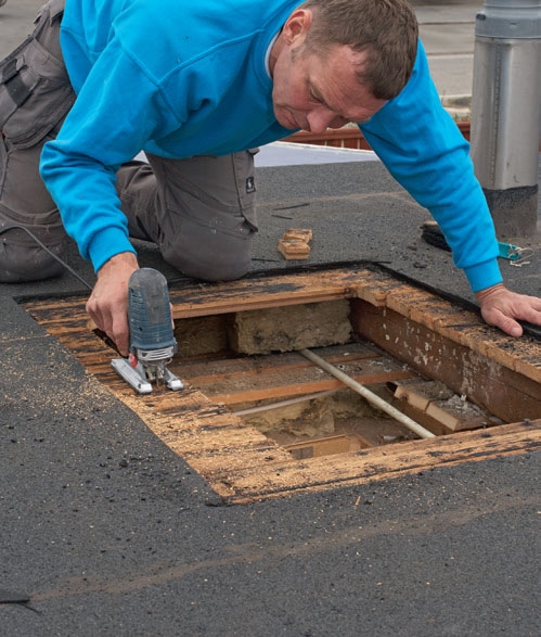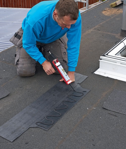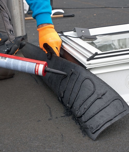 Materialene vi bruker er en klebete tettemasse, nytt takbelegg og profillister.